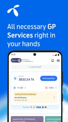 MyGP আপনার দৈনন্দিন ডিজিটাল জীবনের অপরিহার্য সঙ্গী। আপনার গ্রামীণফোন অ্যাকাউন্ট সম্পূর্ণভাবে পরিচালনা করা থেকে শুরু করে বিভিন্ন আকর্ষণীয় সুবিধা গ্রহণ পর্যন্ত, সবকিছুই এখন আপনার হাতের মুঠোয়। MyGP ব্যবহার করে আপনার ইন্টারনেট, মিনিট এবং এসএমএস ব্যালেন্সের পাশাপাশি মূল অ্যাকাউন্ট ব্যালেন্স মুহূর্তেই জেনে নিন। পছন্দের ইন্টারনেট প্যাকগুলিতে ৫০% পর্যন্ত অতিরিক্ত ডেটা বোনাসের একচেটিয়া অফার উপভোগ করুন, যা কেবল MyGP থেকেই সম্ভব। আপনার সুবিধামতো ডেবিট/ক্রেডিট কার্ড, বিকাশ অথবা নগদ ওয়ালেট যুক্ত করে নিরবিচ্ছিন্নভাবে রিচার্জ করুন এবং Flexiplan-এর মাধ্যমে আপনার পছন্দমতো কাস্টম প্যাক তৈরি করার স্বাধীনতা পান।