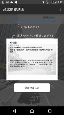 "臺北歷史地圖" অ্যাপটি 1895 থেকে 1974 সালের তাইপের প্রাচীন মানচিত্র ও পুরনো ছবি সংগ্রহ করে। এটি বর্তমান গুগল ম্যাপ ও স্ট্রিট ভিউ-এর সাথে তুলনা করে, ভূ-অবস্থান বৈশিষ্ট্যসহ ব্যবহারকারীদের তাইপের যুগান্তকারী পরিবর্তন দেখতে সাহায্য করে, যেন তারা অতীত ও বর্তমানের মধ্যে ভ্রমণ করতে পারেন।