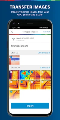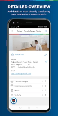 ThermalOn অ্যাপ ব্যবহার করে Bosch GTC থার্মাল ইমেজিং ক্যামেরা এবং Bosch GIS 1000 C Professional ইনফ্রারেড থার্মোমিটার থেকে প্রাপ্ত সমস্ত তাপমাত্রা পরিমাপ স্মার্টফোন বা ট্যাবলেটে সুবিধাজনকভাবে নথিভুক্ত করুন। এটি ডেটা ব্যবস্থাপনাকে আরও সহজ করে তোলে।