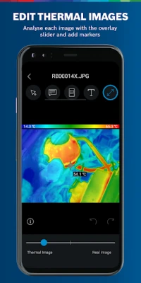 GTC থার্মাল ক্যামেরা ব্যবহারকারীদের জন্য, থার্মালঅন থার্মাল চিত্রগুলি স্থানান্তর ও প্রদর্শনের সুযোগ করে দেয়, যা সহজে JPEG ফাইল হিসাবে শেয়ার করা যায়। পরিমাপের স্থান সহজে চিহ্নিত করার জন্য থার্মাল চিত্র এবং বাস্তব চিত্রের সমন্বয় একটি স্পষ্ট দৃশ্যপট তৈরি করে। এছাড়া, আপনি চিহ্নিতকারী এবং নোট যোগ করতে পারবেন, এবং প্রবেশ করানো নিঃসরণ ক্ষমতা (emissivity value) ও প্রতিফলিত তাপমাত্রা পুনরুদ্ধার করতে পারবেন। অন্যদিকে, GIS ইনফ্রারেড থার্মোমিটার ব্যবহারকারীরা পৃষ্ঠের তাপমাত্রা, আপেক্ষিক আর্দ্রতা, পরিবেষ্টিত তাপমাত্রা, গড় পৃষ্ঠের তাপমাত্রা, যোগাযোগের তাপমাত্রা এবং শিশির বিন্দু তাপমাত্রা সহ বিভিন্ন পরিমাপ সরাসরি তোলা ছবির উপর স্থানান্তর করতে পারবেন। আপনার মোবাইল ডিভাইস ব্যবহার করে কর্মস্থলের ছবি তুলুন এবং সেগুলিতে GIS পরিমাপগুলি নিখুঁতভাবে সংরক্ষণ করুন, সাথে যোগ করার সুবিধা রয়েছে চিহ্নিতকারী এবং নোট।